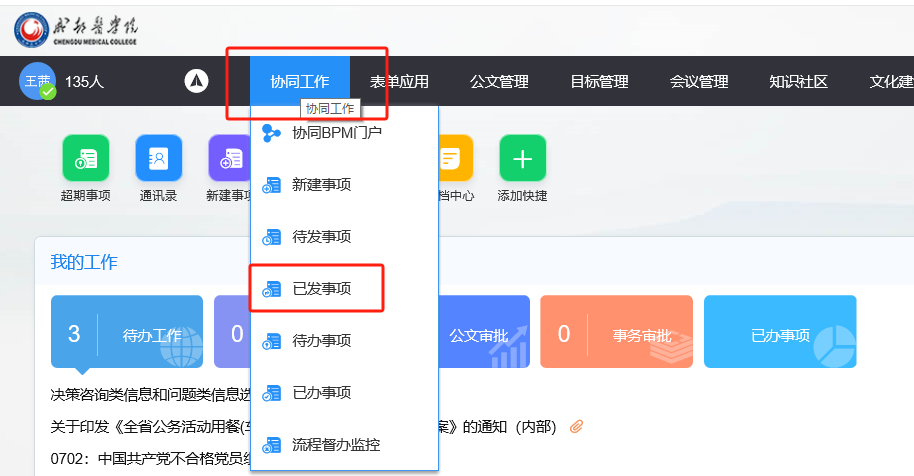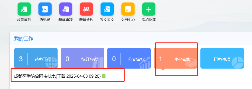三、部门(学院)负责人审核后,承办人在OA首页可见表单。