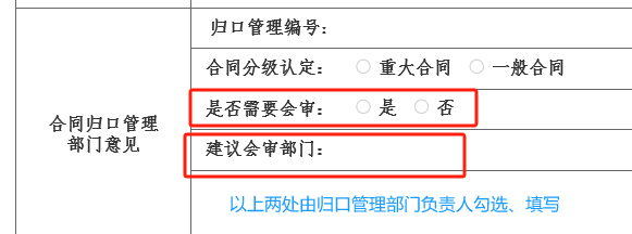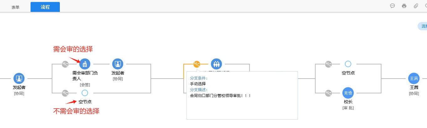 承办人需仔细查看表单中归口管理部门负责人的意见,不需会审的在下一流程中务必选择“空节点”,不要直接选分管校领导姓名。