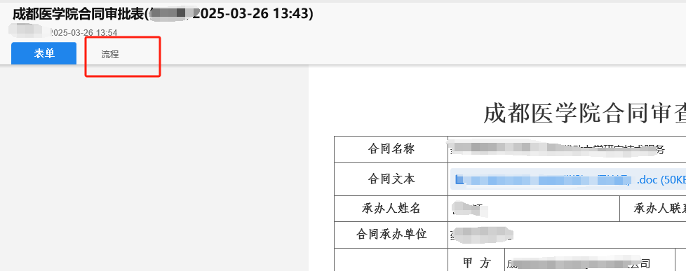 (二)合同范本或非合同范本,流程会到学校法律顾问处,律师审查后,承办人点击查看返回的表单(同第三步图示位置),下拉至“发起人附言”。