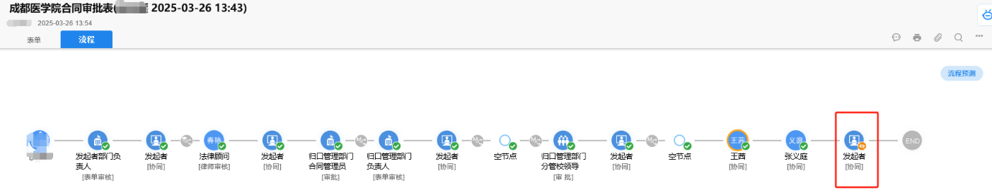 承办人进入“协同工作-已发事项”,点击流程,可查看审查审批进度。黄色眼状图标所在节点,即为当前待办人。如为“发起者”(即承办人本人),需及时提交到下一步流程;如非“发起者”,可点击黄色眼状图标催办当前待办人。