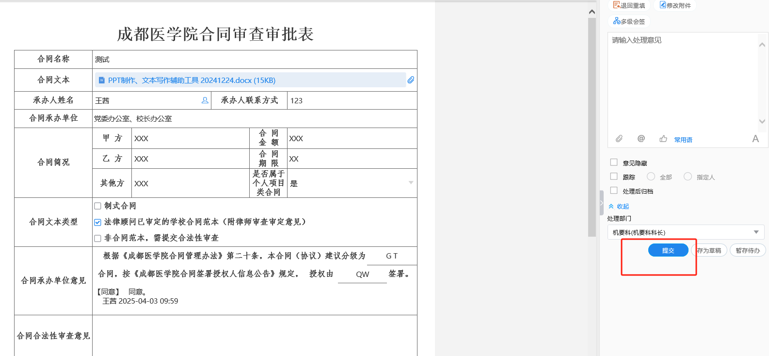 (一)重大合同:承办人点击页面右侧“提交“,选择校长审批,校长审批后流程到达党办、校办。