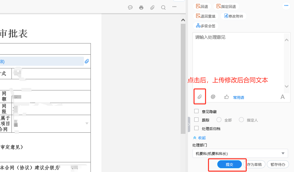2.提交律师审查后,承办人须下拉表单,在“发起人附言”处查看律师反馈意见,是否有修订文本。修改完善后的定稿,务必备注明是修改后的稿件,避免与原稿名称重复。